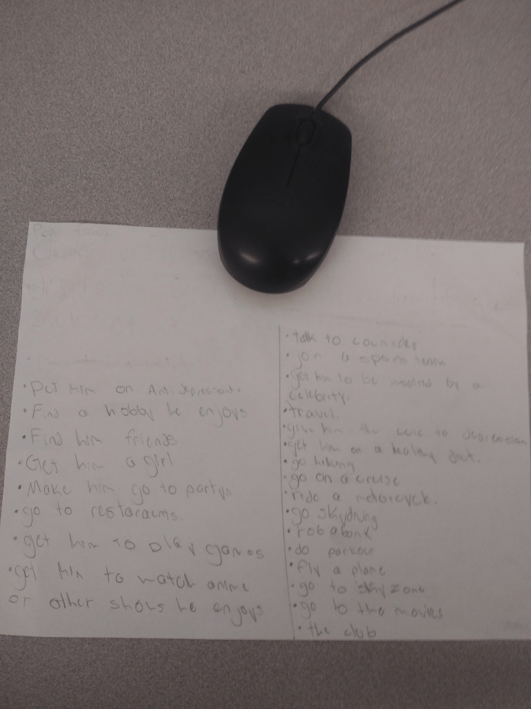 POV Statement: Peter Francis needs help with getting rid of his depression because his family is tired of it.